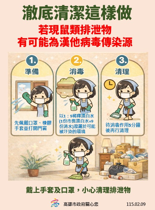 🚨發現鼠類排泄物並進行環境清理工作時,應先佩戴口罩、塑膠手套及塑膠鞋套,並將漂白水(市售)以1:9(清水)稀釋成消毒液,潑灑於可能被污染的環境,5分鐘後再行清理,並於工作完畢時以肥皂澈底清洗雙手,降低感染風險。